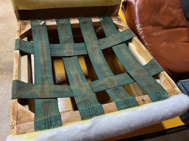 という事でご依頼いただきまして、背・座のウレタン交換と座面下のウェービングゴムの交換を行いまして、三人掛けソファーと同じ生地で張替えました。