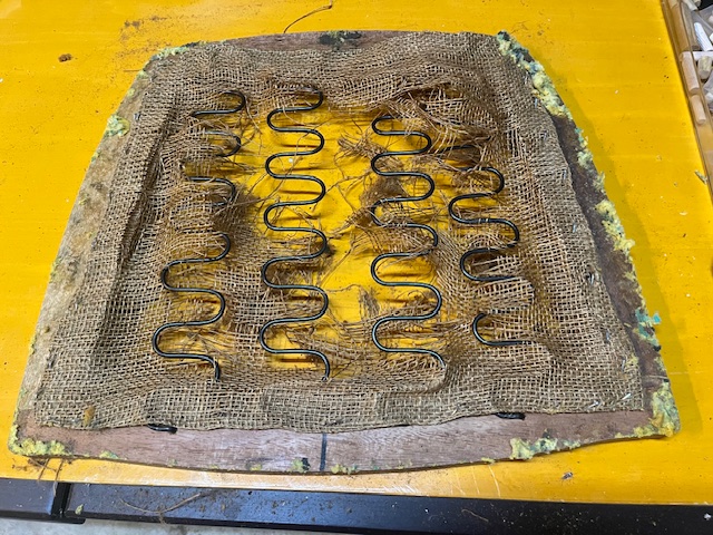 スプリングの補修→スプリングの食い込み防止に生地を張って→ウレタンの交換。